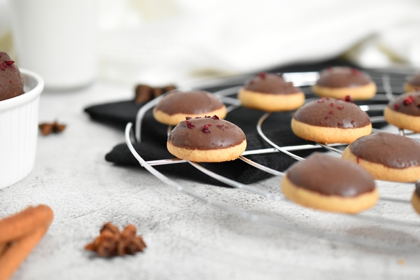 Tremper les biscuits de pain d''épices refroidis dans le glaçage au chocolat ou au blanc d''œuf (pour faire un chapeau) et parsemer de cerises griottes lyophilisées.