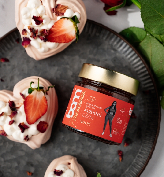 Fouetter la crème. Répartir la confiture de fraises et la crème fouettée sur les pavlovas refroidis. Recouvrir d''un morceau de fraise fraîche et décorer de pétales de roses séchées.