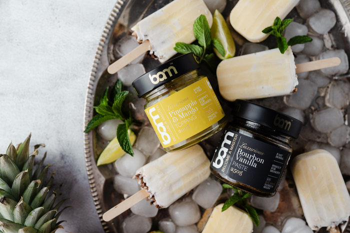 @bamchocolate.com Ready for that summer feeling? These tropical pineapple mango popsicles bring summer straight to your freezer. Creamy Greek yogurt, fruity BAM pineapple mango topping, a touch of honey and BAM Bourbon vanilla come together for a smooth, fresh and perfectly balanced treat. ? Ingredients • 500 g Greek yogurt • BAM pineapple–mango topping • 2 tablespoons BAM Bourbon vanilla • 1 tablespoon honey • juice of ½ lime • 100 g granola Instructions: Prepare the mixtures: Divide the Greek yogurt into two bowls. Place about 1/3 in one bowl and the remaining 2/3 in the other. Mix the BAM pineapple mango topping into the smaller portion of yogurt to create a smooth fruit layer. Add BAM Bourbon vanilla, honey and lime juice to the larger portion of yogurt and mix until creamy and aromatic. Fill the popsicle molds: Fill each mold about 1/3 full with the pineapple mango mixture. Top with the vanilla yogurt mixture until full. Add crunch: Sprinkle granola over the top of each popsicle for extra texture and crunch. Freeze: Insert the popsicle sticks. Freeze for at least 8 hours, preferably overnight, until fully set. Enjoy your creamy, refreshing tropical pineapple–mango popsicles anytime you need a taste of summer. #pineapplemangopopsicles #tropicalpopsicles #summerdessert #frozendessert #homemadepopsicles #bamcokolada #mojacokolada #mojacokoladasi #bam #becomeamaster